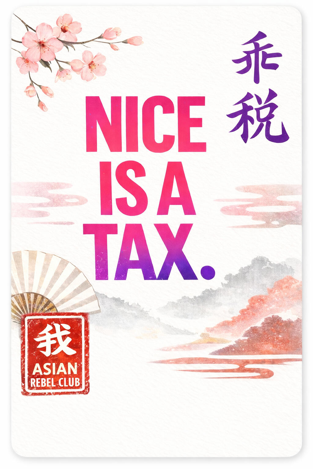 The front holds up a mirror and says: this is real.Example Rule: Nice Is A Tax